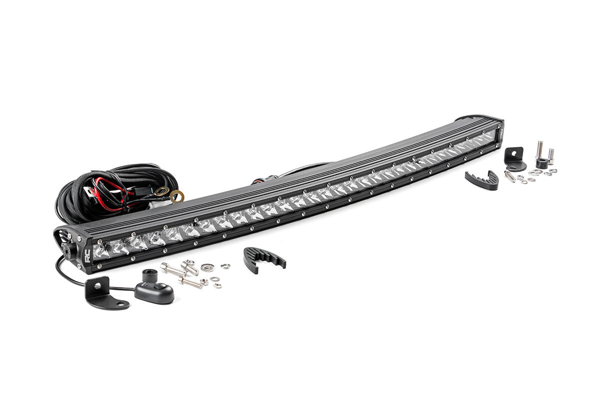 Command the Dark: Stay out later on the trails with Rough Country's low-profile 30-inch Curved Single-Row CREE LED Light Bar. This sleek, slim-line single row light bar offers enormous lighting power in a stylish, modern frame. With a powerful 12,000 Lumens and 150 Watt output, Rough Country?ÇÖs 30-inch Curved Single-Row LED light is a sight to behold. Rough Country?ÇÖs LED Light Bars include a durable die-cast aluminum, IP67 waterproof housing for unsurpassed protection against the elements. Each LED also features a premium flat-wound, braided, IP68 waterproof wiring harness with a toggle switch and in-line fuse. Tired of wind noise? Each 30?ǥ Curved LED Light Bar includes a set of noise silencers to eliminate harmonic vibration caused by wind hitting the light during higher speeds. For peace of mind, each LED also includes Rough Country?ÇÖs 3-year Warranty.