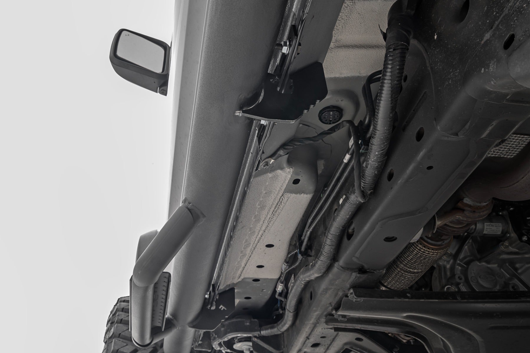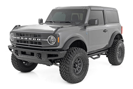 Step up in Style. It's time to put your lifted vehicle a step ahead of the others! Rough Country's new 3-Inch Side Steps are the perfect upgrade for your Ford Bronco. Featuring a high positioned bar these steps not only provide ease of access they fit tight to the Bronco for a cleaner look!\ Durable and Affordable. Rough Country's 3-Inch Nerf Steps extend from one wheel well opening to the next, offering a clean install that lends to the look of your lifted truck. These steps can be installed on any vehicle, with or without a body lift. Our innovative design actually hides any exposed frame you see under the truck, offering extra protection for your rocker panels. Rough Country Nerf Steps are Made out of ultra-durable .084 Wall corrosion-resistant tubing with a Zinc Base Coat and Black Finish for a sharp look that's ready to withstand the elements.\ Installation: Rough Country's 3-Inch Side Steps can be easily installed with an estimated 1-2 hours install time.\ Warranty: Rough Country's 3-Inch Nerf Steps have a limited lifetime replacement warranty towards manufacturer defects. As such, the product is protected from structural and workmanship damage after the date of purchase. With our industry-leading warranty, give yourself peace of mind when using Rough Country's products.