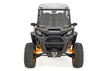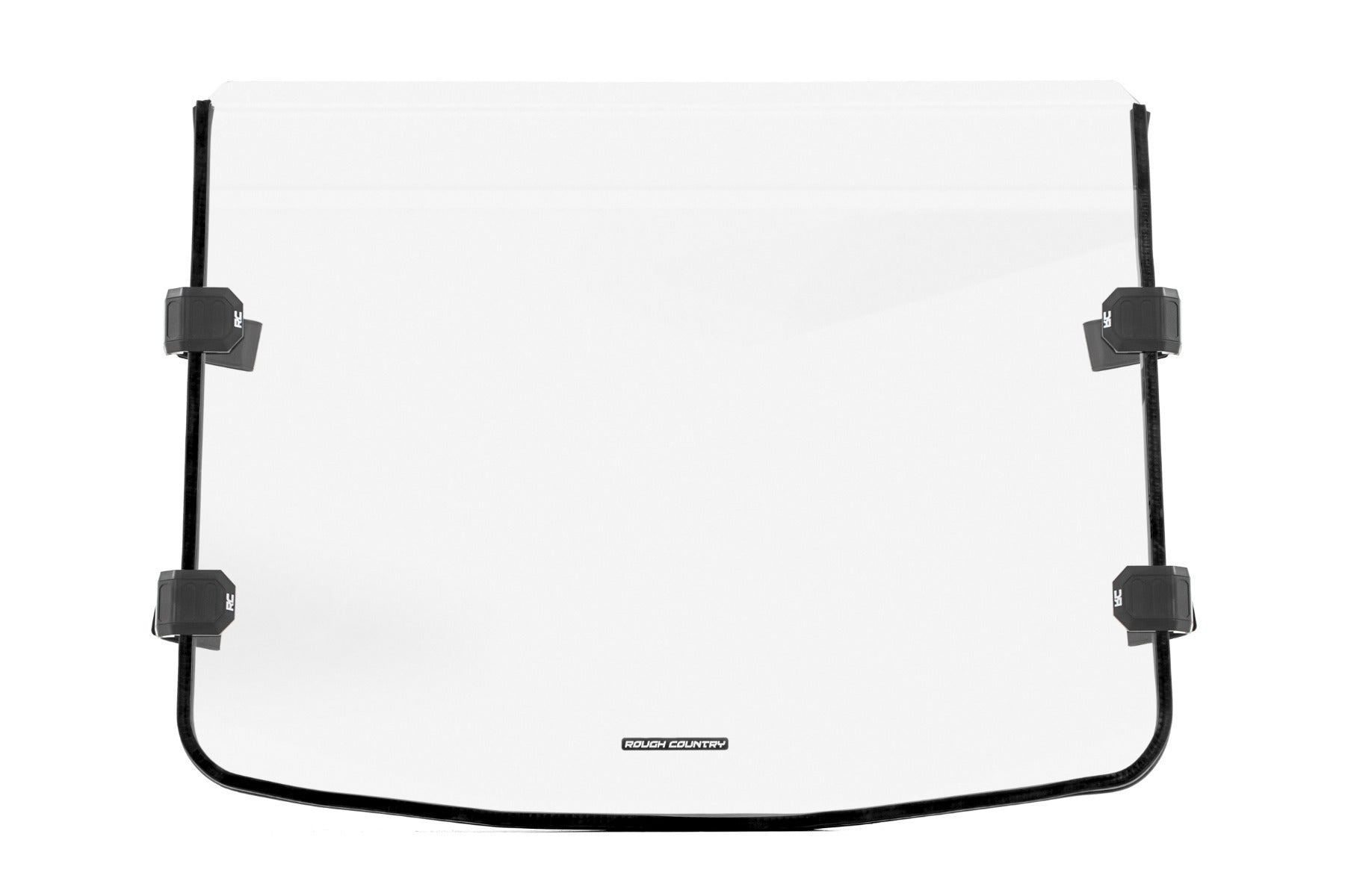 Added Protection and comfortability. Protect the occupants of your Can-Am Commander from off-road hazards such as rocks, branches, and other debris with Rough Country's Scratch-Resistant Windshields. UTV Windshields offer a clear visual of the trail ahead and allow for a much more comfortable outing!\ High-Quality Polycarbonate Construction. Rough Country UTV windshields are constructed from thick polycarbonate material that is precision cut for a perfect fit. The polycarbonate material provides an ideal combination of clarity, flexibility, durability that outperforms glass, acrylic, and other windshield materials.\ Durable Scratch and UV Resistance. Each windshield is not only constructed from thick polycarbonate material but enhanced by a secondary AR2 hard-coating process. This process completely coats the windshield with a hardened, scratch-resistant barrier. This treatment also provides the additional benefit of UV protection.\ Easy Installation. With a simple strap-on installation process, installing a Rough Country windshield couldn't be easier. Within 15 ?Çô 30 mins you can be ready to hit the trails.\ Limited-Lifetime Replacement Warranty. Rough Country's Scratch-Resistant Windshields are backed with a limited lifetime replacement warranty towards manufacturer defects. As such, the product is protected from structural and workmanship damage after the date of purchase. With our industry-leading warranty give yourself peace of mind when using Rough Country's Suspension products!