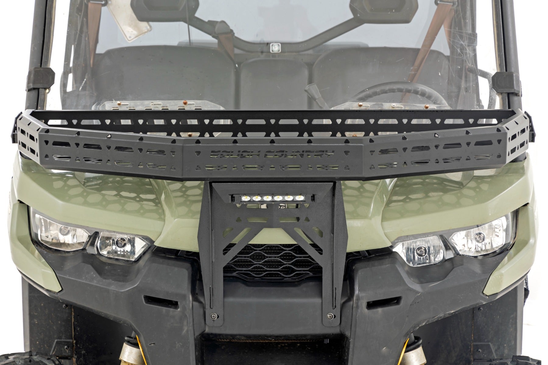 Easy Access. Overland adventures require bringing plenty of gear along for the ride. Ensure that your Can-Am Defender has plenty of cargo space by installing Rough Country's Front Cargo Rack Kit. This rock-solid rack design can provide storage to haul all of your gear without sacrificing your cab, or bed space!\ Durable Construction. Rough Country's cargo rack kit is constructed from heavy-duty steel and features a laser-cut mesh pattern that provides plenty of mounting points to secure your load. Since adventure doesn't end when the sun goes down, this kit includes a 6" slimline LED light bar. Whether you?ÇÖre off the beaten path at sunset or gathering all your gear before dawn, you?ÇÖll be glad to have access to additional lighting power to tackle the task at hand. Rough Country?ÇÖs all-weather LED lights feature a durable, IP67 Waterproof, die-cast aluminum housing and include a premium wiring harness with a toggle switch.\ Installation. With minor drilling required for installation, an estimated timeframe of 3-4 hours is recommended to complete this full installation. This full kit can be installed at home and can be completed efficiently and quickly!\ Limited Lifetime Replacement Warranty. Rough Country?ÇÖs Front Cargo Rack is backed with a limited lifetime replacement warranty towards manufacturer defects. As such, the product is protected from structural and workmanship damage after the date of purchase. With our industry-leading warranty give yourself peace of mind when using Rough Country's Suspension products!