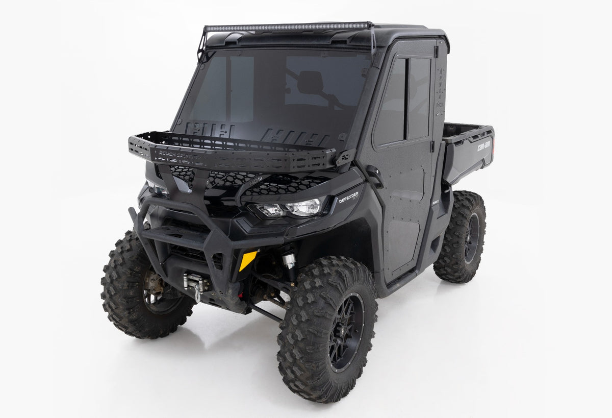 Easy Access. Overland adventures require bringing plenty of gear along for the ride. Ensure that your Can-Am Defender has plenty of cargo space by installing Rough Country's Front Cargo Rack Kit. This rock-solid rack design can provide storage to haul all of your gear without sacrificing your cab, or bed space!Durable Construction. Rough Country's cargo rack kit is constructed from heavy-duty steel and features a laser-cut mesh pattern that provides plenty of mounting points to secure your load.Installation. With minor drilling required for installation, an estimated timeframe of 3-4 hours is recommended to complete this full installation. This full kit can be installed at home and can be completed efficiently and quickly!Limited Lifetime Replacement Warranty. Rough Country?ÇÖs Front Cargo Rack is backed with a limited lifetime replacement warranty towards manufacturer defects. As such, the product is protected from structural and workmanship damage after the date of purchase. With our industry-leading warranty give yourself peace of mind when using Rough Country's Suspension products!