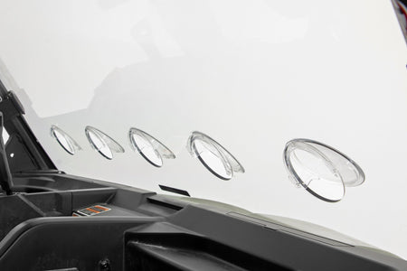 - Width: 50.9" Height: 30.35" Features 5 adjustable vents. Vents easily rotate 360 degrees to allow for desired direction of airflow. Durable, thick polycarbonate construction. Inner and outer hard coating to resist scratching. Contoured design. Rubber seal for a precise fit. Works with factory or aftermarket roofs. Easy to install.