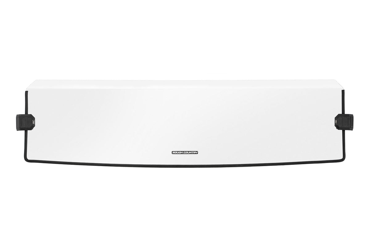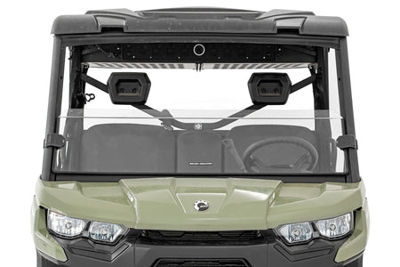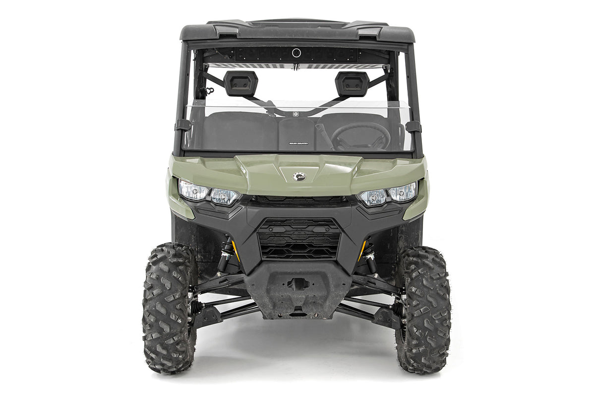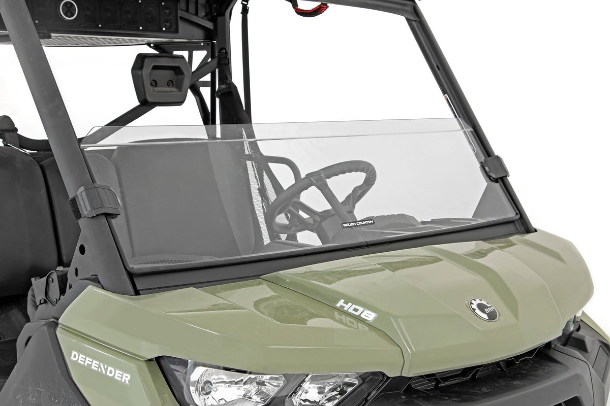 Added Protection and comfortability. Protect the occupants of your Can-Am Defender from off-road hazards such as rocks, branches, and other debris with Rough Country's Scratch-Resistant Windshields. UTV Windshields offer a clear visual of the trail ahead and allow for a much more comfortable outing!\ High-Quality Polycarbonate Construction. Rough Country UTV windshields are constructed from thick polycarbonate material that is precision cut for a perfect fit. ?áThe polycarbonate material provides an ideal combination of clarity, flexibility, durability that outperforms glass, acrylic, and other windshield materials.?á\ Durable Scratch and UV Resistance. Each windshield is not only constructed from thick polycarbonate material but enhanced by a secondary AR2 hard-coating process.?á This process completely coats the windshield with a hardened, scratch-resistant barrier.?á This treatment also provides the additional benefit of UV protection.\ Easy Installation.?áWith a simple strap-on installation process, installing a Rough Country windshield couldn't be easier.?á Within 15 ?Çô 30 mins you can be ready to hit the trails. ?á\ Limited-Lifetime Replacement Warranty. Rough Country's Scratch-Resistant Windshields are backed with a limited lifetime replacement warranty towards manufacturer defects. As such, the product is protected from structural and workmanship damage after the date of purchase. With our industry-leading warranty give yourself peace of mind when using Rough Country's Suspension products!