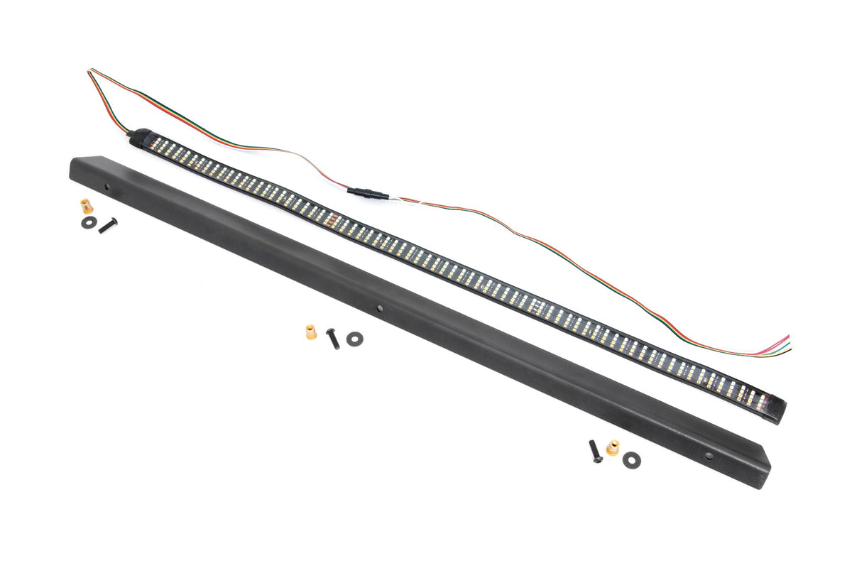 Take your Can-Am's functionality to new levels with Rough Country?ÇÖs Quad-Row Multifunction LED Tailgate Light Strip. This LED Light Strip has multiple modes, with a series of red and white LED?ÇÖs all tied into the same strip. This tailgate upgrade offers bright and dim red light options, white reverse lights, and half-panel red turn signals.\ With 288 LED's, this flexible strip adds increased driving capabilities in the dark. Whether you find yourself on the trails off-roading at night or getting the work done first thing before the sun comes up, Rough Country?ÇÖs Can-Am Defender Multi-Function LED Tailgate Light Strip has you covered.\ These Multifunction LED Tailgate Light Strips are easy to install and wire in to your UTV?ÇÖs factory wiring harness?áfor immediate use. The LED strip itself adheres with a strip of pre-installed 3M automotive-grade adhesive padding that goes on fast and stays put. These handy tailgate LED Lights attached to the included L-bracket that installs under the tailgate of your Defender. Each Multi-Function Tailgate LED strip features an IP68 Waterproof design, guaranteed to resist dust and even prolonged water immersion. Includes Rough Country?ÇÖs 3-year limited Warranty.