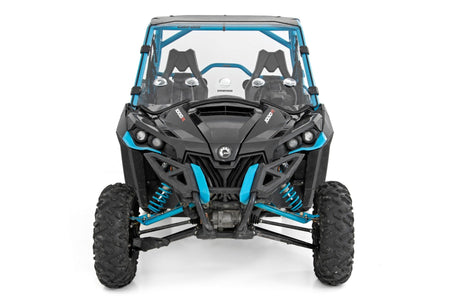 Added Protection and comfortability. Protect the occupants of your Can-Am Maverick from off-road hazards such as rocks, branches, and other debris with Rough Country's Scratch-Resistant Windshields. UTV Windshields offer a clear visual of the trail ahead and allow for a much more comfortable outing!\ High-Quality Polycarbonate Construction. Rough Country UTV windshields are constructed from thick polycarbonate material that is precision cut for a perfect fit. The polycarbonate material provides an ideal combination of clarity, flexibility, durability that outperforms glass, acrylic, and other windshield materials.\ Durable Scratch and UV Resistance. Each windshield is not only constructed from thick polycarbonate material but enhanced by a secondary AR2 hard-coating process. This process completely coats the windshield with a hardened, scratch-resistant barrier. This treatment also provides the additional benefit of UV protection.\ Easy Installation. With a simple strap-on installation process, installing a Rough Country windshield couldn't be easier. Within 15 ?Çô 30 mins you can be ready to hit the trails.\ Limited-Lifetime Replacement Warranty. Rough Country's Scratch-Resistant Windshields are backed with a limited lifetime replacement warranty towards manufacturer defects. As such, the product is protected from structural and workmanship damage after the date of purchase. With our industry-leading warranty give yourself peace of mind when using Rough Country's Suspension products!