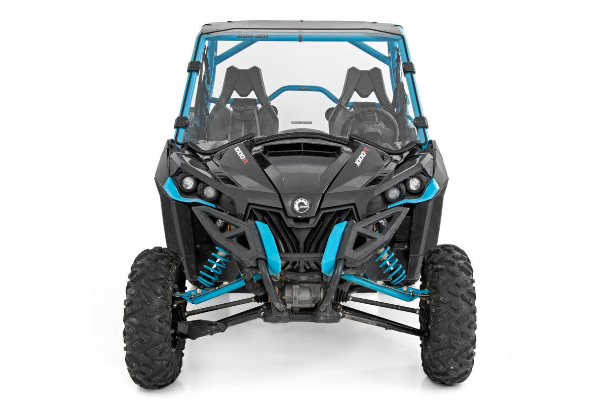 Added Protection and comfortability. Protect the occupants of your Can-Am Maverick from off-road hazards such as rocks, branches, and other debris with Rough Country's Scratch-Resistant Windshields. UTV Windshields offer a clear visual of the trail ahead and allow for a much more comfortable outing!\ High-Quality Polycarbonate Construction. Rough Country UTV windshields are constructed from thick polycarbonate material that is precision cut for a perfect fit. ?áThe polycarbonate material provides an ideal combination of clarity, flexibility, durability that outperforms glass, acrylic, and other windshield materials.?á\ Durable Scratch and UV Resistance. Each windshield is not only constructed from thick polycarbonate material but enhanced by a secondary AR2 hard-coating process.?á This process completely coats the windshield with a hardened, scratch-resistant barrier.?á This treatment also provides the additional benefit of UV protection.\ Easy Installation.?áWith a simple strap-on installation process, installing a Rough Country windshield couldn't be easier.?á Within 15 ?Çô 30 mins you can be ready to hit the trails. ?á\ Limited-Lifetime Replacement Warranty. Rough Country's Scratch-Resistant Windshields are backed with a limited lifetime replacement warranty towards manufacturer defects. As such, the product is protected from structural and workmanship damage after the date of purchase. With our industry-leading warranty give yourself peace of mind when using Rough Country's Suspension products!