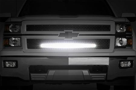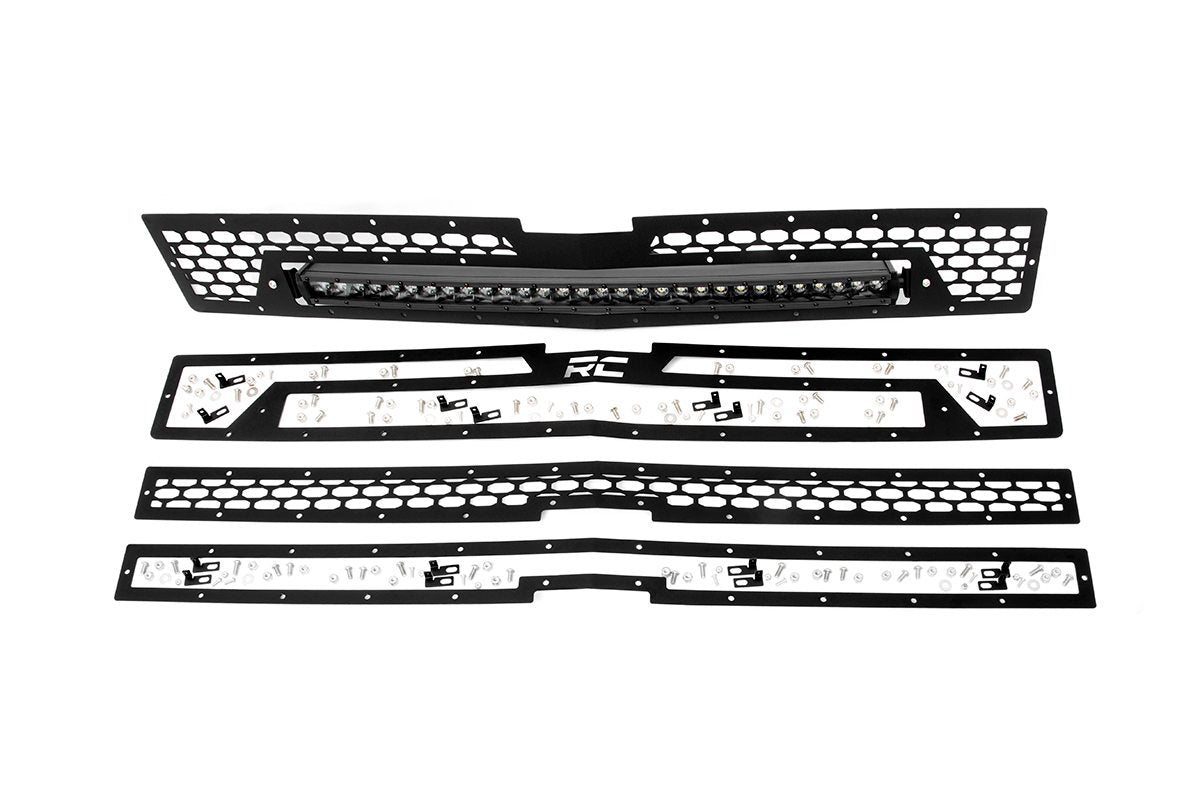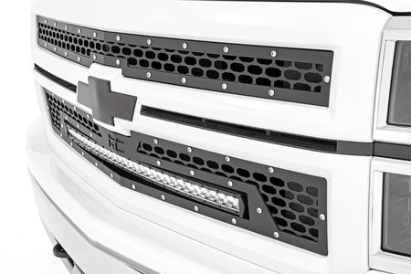 Give the front-end of your 14-15 Chevy 1500 a unique look with Rough Country?ÇÖs Mesh Grille kit. This grille replacement kit swaps out your stock grille with the eye-catching, head-turning good looks of this aftermarket upgrade. With a unique, laser-cut mesh pattern surrounded by stylish, stainless steel button-head bolts, this grill gives your truck a more menacing look that?ÇÖs sure to draw attention. Each kit is powder coated black to resist corrosion and give a long lifespan of good looks! This kit features a Rough Country's 30?ǥ Curved Single-Row Black-Series LED light bar with Cree LED's outputting a staggering 12,000 Lumens and 150 Watts of lighting power. Includes a mountable on/off switch, wiring harness, and our 3 Year Warranty!