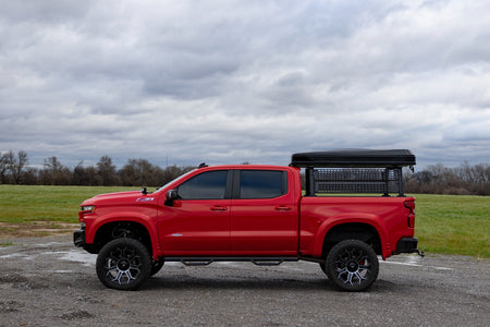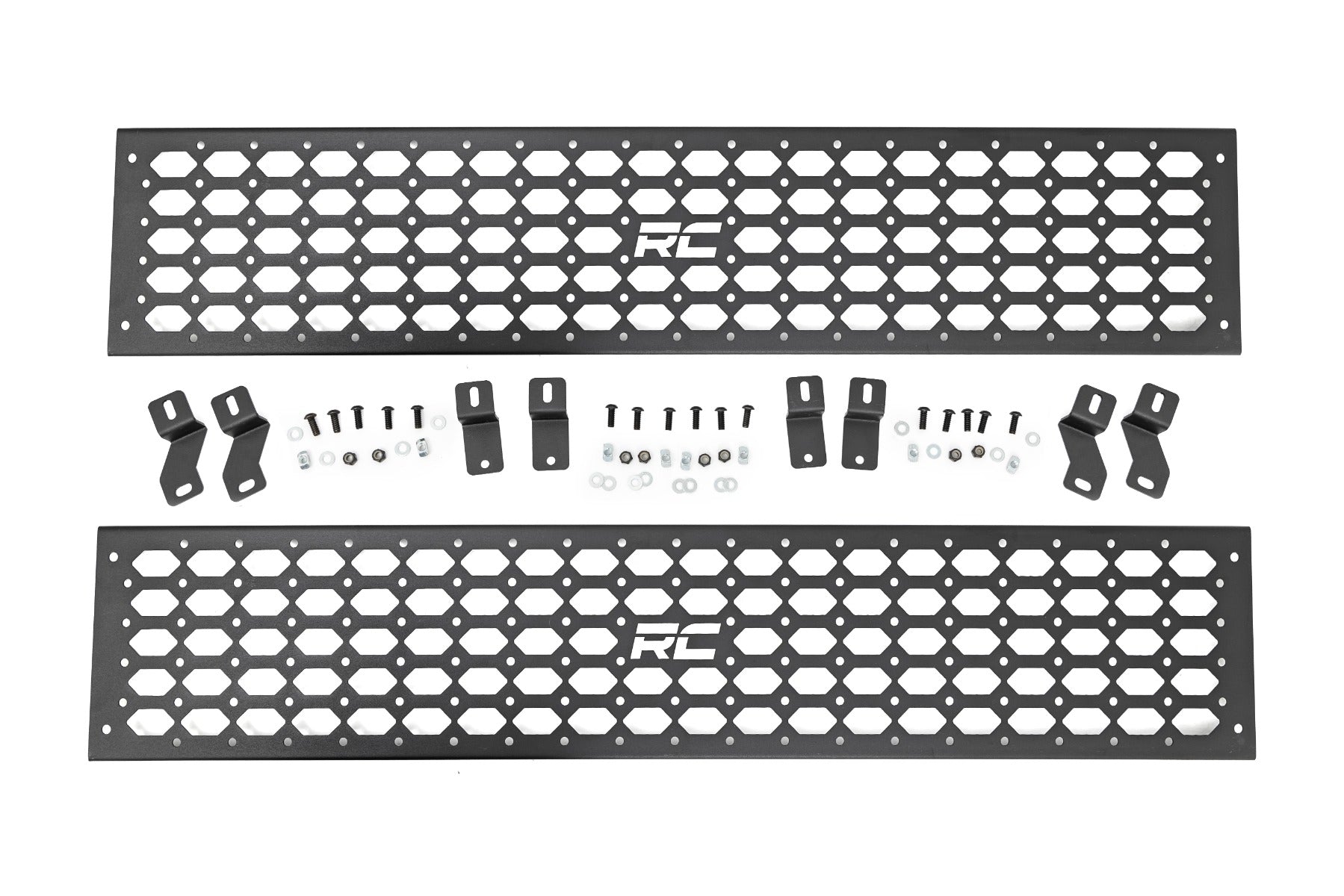 Organize your gear. The Rough Country's Chevy Silverado 1500 Bed Rack Molle Panel offers numerous benefits to Silverado 1500 owners. Say goodbye to cluttered and disorganized truck beds and take advantage of unlimited accessory attachment options that allow you to make the most of your bed space.\ A Perfect Fit. This 14GA steel panel is designed specifically for the fourth-generation Chevy Silverado 1500 Bed Rack, ensuring a seamless fit and easy installation. Our Molle Panels are laser cut and welded to seamlessly fit your Bed Rack. They feature a durable powder coat finish that adds an extra layer of protection, ensuring that this product will last for years. Upgrade your truck bed with the Rough Country Chevy Silverado Bed Rack Molle Panel.