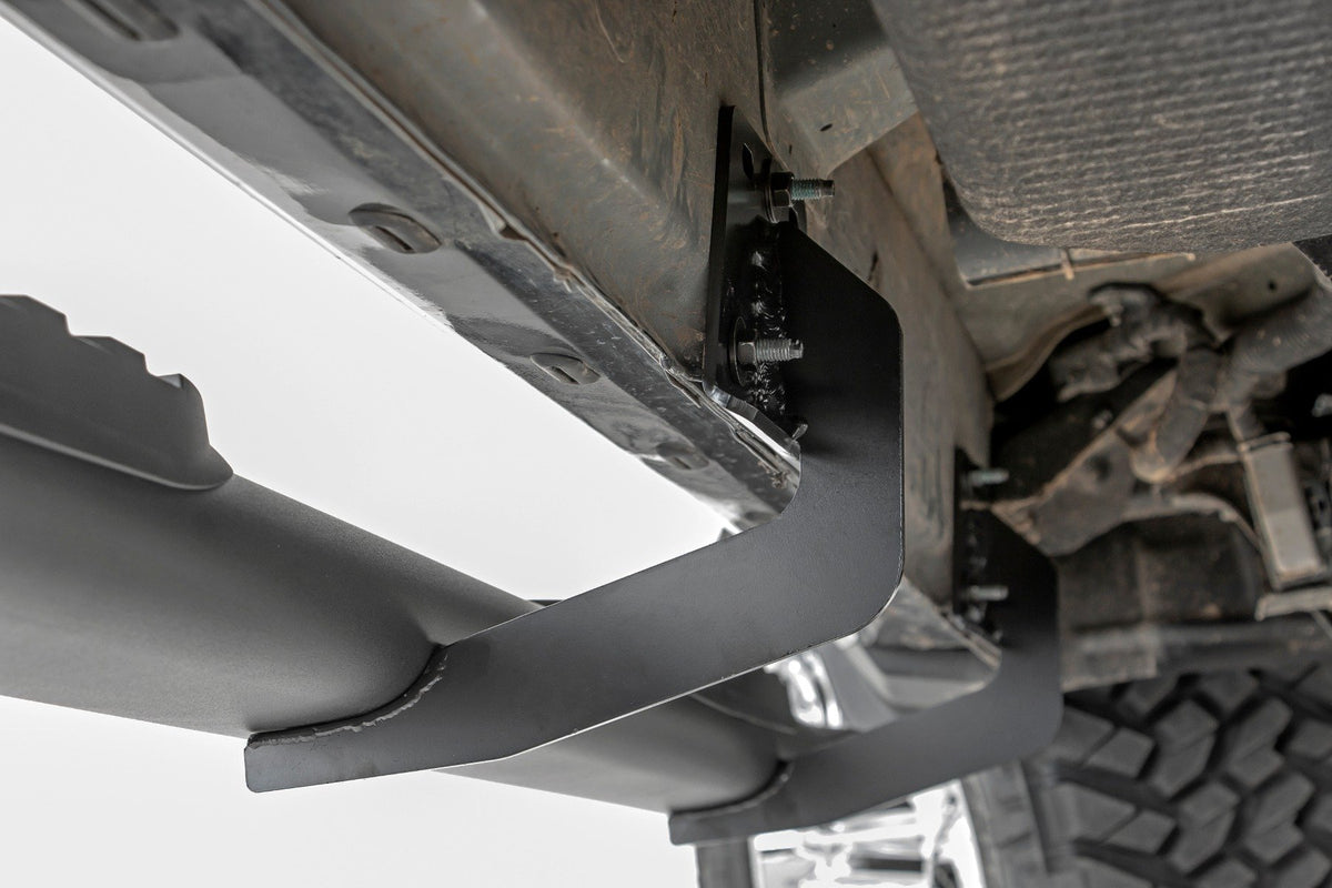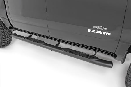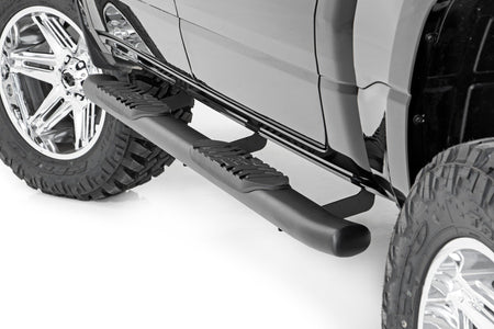 Gain easier access to your cab with the classic, OEM look of Rough Country?ÇÖs Oval Nerf Step Bars. These durable, steel side steps feature a comfortable, 4.5-inch wide stepping area built into a large, tubular nerf rail that mimics the look of the popular OEM oval step design.\ Each nerf board features a long-lasting black powder coat and durable steel construction that can support up to 500lbs! Each step offers a 30-degree angled end design looks great on any vehicle. A secure, 4.5-inch wide stepping area features a non-slip pad to ensure a confident footing each and every time.