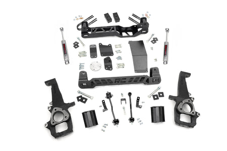 Give your RAM 1500 the perfect blend of performance, protection, and style with Rough Country's 4-inch Suspension Lift. Designed to offer an affordable way to maximize off-road performance and run up to 35-inch tires, these kits offer high quality, heavy-duty equipment for new model RAM 1500?ÇÖs.\ Utilizing heavy-duty, laser cut, steel equipment engineered by Rough Country, these 4-inch Suspension Lifts are complete kits that include everything needed for outstanding off-road performance. High-clearance front and rear cross-members provide enough room for off-road climbs and runs. A heavy-duty skid plate shields the vehicle?ÇÖs differential, protecting you from hazardous terrain. A durable set of driver and passenger side lifted cast knuckles are also included, helping to promote proper geometry once the vehicle is lifted.\ For true trailblazers, this kit also ships with a set of rear N3 Nitrogen-charged shock absorbers - valved specifically for a blend of on and off-road performance. Includes Rough Country's Lifetime Replacement Guarantee!