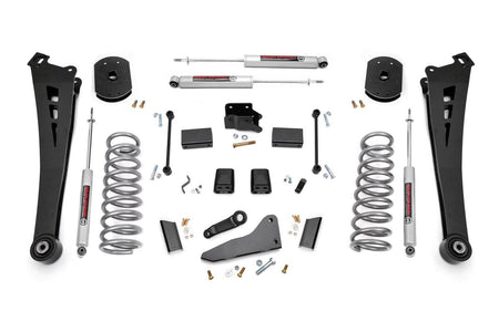 Compliment your Power Wagon's aggressive, good looks with Rough Country's new 4.5-inch Lift Kit with lifted coil springs. RAM Power WagonTrucks come with a wealth of impressive features right from the factory. Rough Country's 4.5-inch kit was engineered to retain these impressive factory specs while bumping up performance and durability where it's needed most. The result is a lifted beast with a mean profile and lush ride-quality that'll make other RAM owners wonder where you got yours from! When changing a vehicle's suspension the key to preserving ride quality is in keeping the geometry of all suspension components as close to their factory angles as possible. Rough Country's 4.5-inch Suspension kit features a set of ultra-durable Radius Arms, precision fit to bolt right into the factory mounts for an easier install and a more factory-like angle. These beefy, upgraded Radius Arms also feature a durable, durable rubber bushings for maximum vibration absorption. This kit also includes a set of front, lifted coil springs for unparalleled ride quality from your lifted Dodge Ram. This kit also includes Rough Country?ÇÖs N3 Shock Absorbers. These 10-stage variable valving, high-pressure Nitrogen charged shocks offer a fantastic blend of off-road action and smooth highway ride quality. Each kit includes Rough Country?ÇÖs Lifetime Replacement Guarantee!
