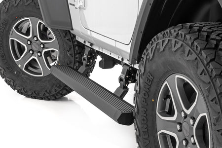 Step up in style.?ǻSidesteps have come a long way, and now we've taken them to the next level with Rough Country's?ǻPower Running Boards! These retractable E-Boards tuck tight?ǻfor a clean look when not in use and automatically extend when the door is opened. With an anti-slip surface that provides a secure stepping area, getting in and out of your ride has never been easier.?ǻOur Power Running Boards also?ǻinclude LED lights that provide illumination when deployed and shut off when steps are closed, providing a sleek, aerodynamic look.\ ?ǻPremium Construction. The Rough Country E-Board Steps combine durability, strength, and style. These 4.75" all-season steps are made from lightweight yet durable aluminum and can support up to 660 lbs per side. Equipped with dual motor technology, these steps can handle anything Mother Nature throws their way. They feature an automatic 'SAFE-STOP' mechanism that engages if a blockage is detected and include an interior bypass switch for manual override. So whether you're heading out on a weekend errand or loading up for a camping trip, our electric steps offer reliable protection for all your adventures.\ Installation.?ǻThese easy-to-install steps are the perfect solution for getting in and out of your vehicle. No drilling is required for installation, and the steps tuck tight under the rocker panel?ǻwhen not in use. Don't struggle to get in and out of your vehicle anymore. Make life easier with Rough Country's Power Running Boards.\ Warranty. Rough Country backs its products with a five-year limited replacement warranty. Our products are protected from structural and workmanship damage after purchase. Our industry-leading warranty gives you peace of mind when using Rough Country products!
