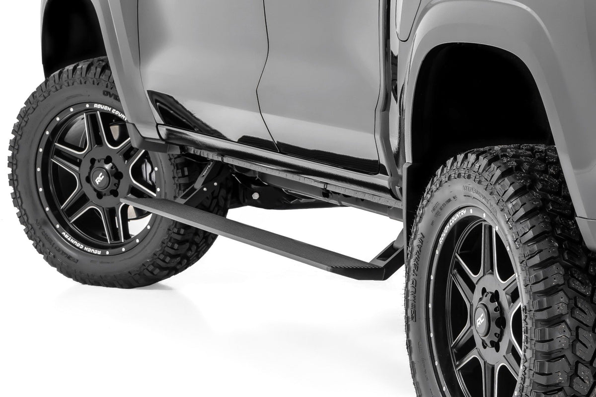 Step up in style.?ǻSidesteps have come a long way, and now we've taken them to the next level with Rough Country's?ǻPower Running Boards! These retractable E-Boards tuck tight?ǻfor a clean look when not in use and automatically extend when the door is opened. With an anti-slip surface that provides a secure stepping area, getting in and out of your ride has never been easier.?ǻOur Power Running Boards also?ǻinclude LED lights that provide illumination when deployed and shut off when steps are closed, providing a sleek, aerodynamic look.\ ?ǻPremium Construction. The Rough Country E-Board Steps combine durability, strength, and style. These 6" all-season steps are made from lightweight yet durable aluminum and can support up to 660 lbs per side. Equipped with dual motor technology, these steps can handle anything Mother Nature throws their way. They feature an automatic 'SAFE-STOP' mechanism that engages if a blockage is detected and include an interior bypass switch for manual override. So whether you're heading out on a weekend errand or loading up for a camping trip, our electric steps offer reliable protection for all your adventures.\ Installation.?ǻThese easy-to-install steps are the perfect solution for getting in and out of your vehicle. No drilling is required for installation, and the steps tuck tight under the rocker panel?ǻwhen not in use. Don't struggle to get in and out of your vehicle anymore. Make life easier with Rough Country's Power Running Boards.\ Warranty. Rough Country backs its products with a limited lifetime replacement warranty. Our products are protected from structural and workmanship damage after purchase. Our industry-leading warranty gives you peace of mind when using Rough Country products!