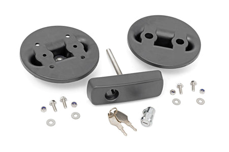 Secure your fluid container to your rig with Rough Country's Fluid Container Locker Kit.\ Mounting Attachments with Lockable Feature: Securing your fluid container during bumpy off-road adventures is a breeze. This kit includes an easily mountable attachment that can be locked in place. This lockable feature guarantees the safety and security of your fluids, providing peace of mind as you navigate rough terrains.\ Limited Lifetime Warranty: Rough Country's Fluid Container Locker Kit is backed with a three-year warranty towards manufacturer defects. As such, the product is protected from structural and workmanship damage after the date of purchase. With our industry-leading warranty give yourself peace of mind when using Rough Country's Suspension products!