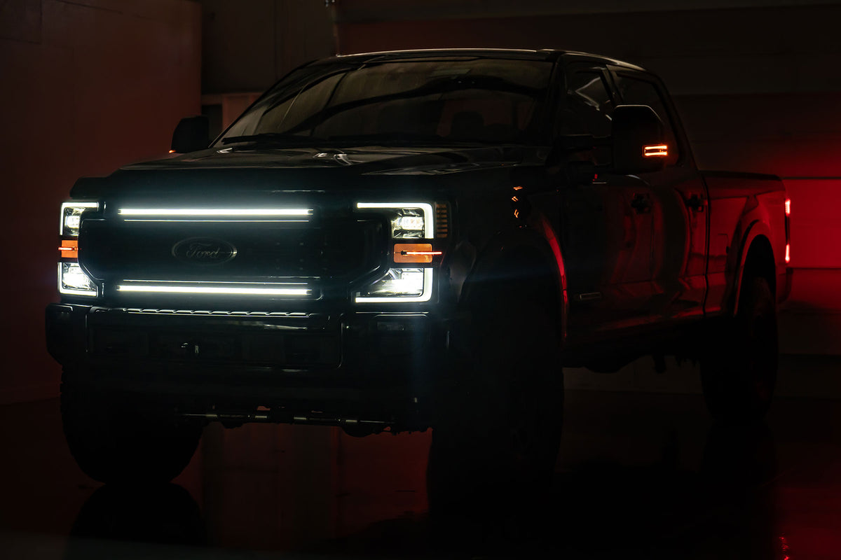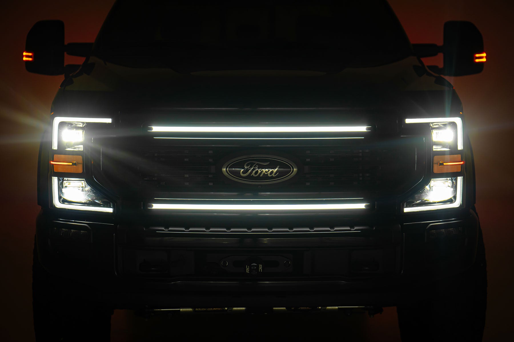 Tired of being caught in the dark? Our Grille Mount LED Light Kit is the answer to your nighttime needs. Designed specifically for the Ford F-250/F-350 Super Duty, this kit brings the brightness you need to tackle those moonless nights and foggy mornings with confidence.Blazing Brightness: This kit packs 324 LED chips that provide a powerful beam to light up even the darkest trails, ensuring you see every rock, rut, and mud puddle in your way.Durable Materials: Our lights, featuring a tough-as-nails aluminum housing and IP68 waterproof rating, are ready to withstand Mother Nature's wrath.Precision Lighting: The nylon reflector and silicone lens surface work together to deliver a focused, clear light. Say goodbye to scattered beams and hello to a sharp, consistent light that shows you exactly where you?ÇÖre headed.Long-Lasting Power: Running on 12V power and 32 watts, these lights are built to last over 50,000 hours. That's a whole lot of night drives, camping trips, and late-night work sessions.Complete Kit: No need to hunt down extra parts ?Çô this kit includes everything you need: mounting brackets, hardware, and harness. Just mount it, wire it up, and hit the road.The Grille Mount LED Light Kit for your Ford F-250/F-350 Super Duty is the upgrade you didn?ÇÖt know you needed but won?ÇÖt be able to live without. Whether you?ÇÖre navigating rugged terrain or setting up camp after dark, this kit has you covered. Light up the night with Rough Country?ÇÖs Grille Mount LED Light Kit!