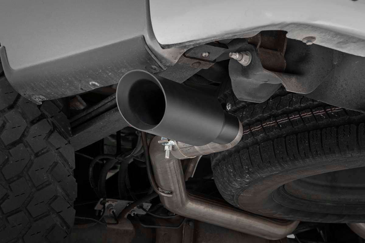 Give your truck an aggressive, throaty growl and killer good looks with Rough Country?ÇÖs Dual Cat-Back Exhaust System for Ford F-150 . These durable exhaust systems are fine tuned to improve air flow and deliver and the perfect aftermarket exhaust note that will put a smile on your face every time you hit the gas. Each kit features a set of high-temp resistant, dual-wall 304 black stainless tips with RC logo for an improved, aggressive look. Upgrading your exhaust note has never been easier! Each kit conveniently installs onto the factory hangers and features stainless clamps for easy assembly with no welding required! Transform your truck today and let your engine ROAR with the best F-150 exhaust kit money can buy!