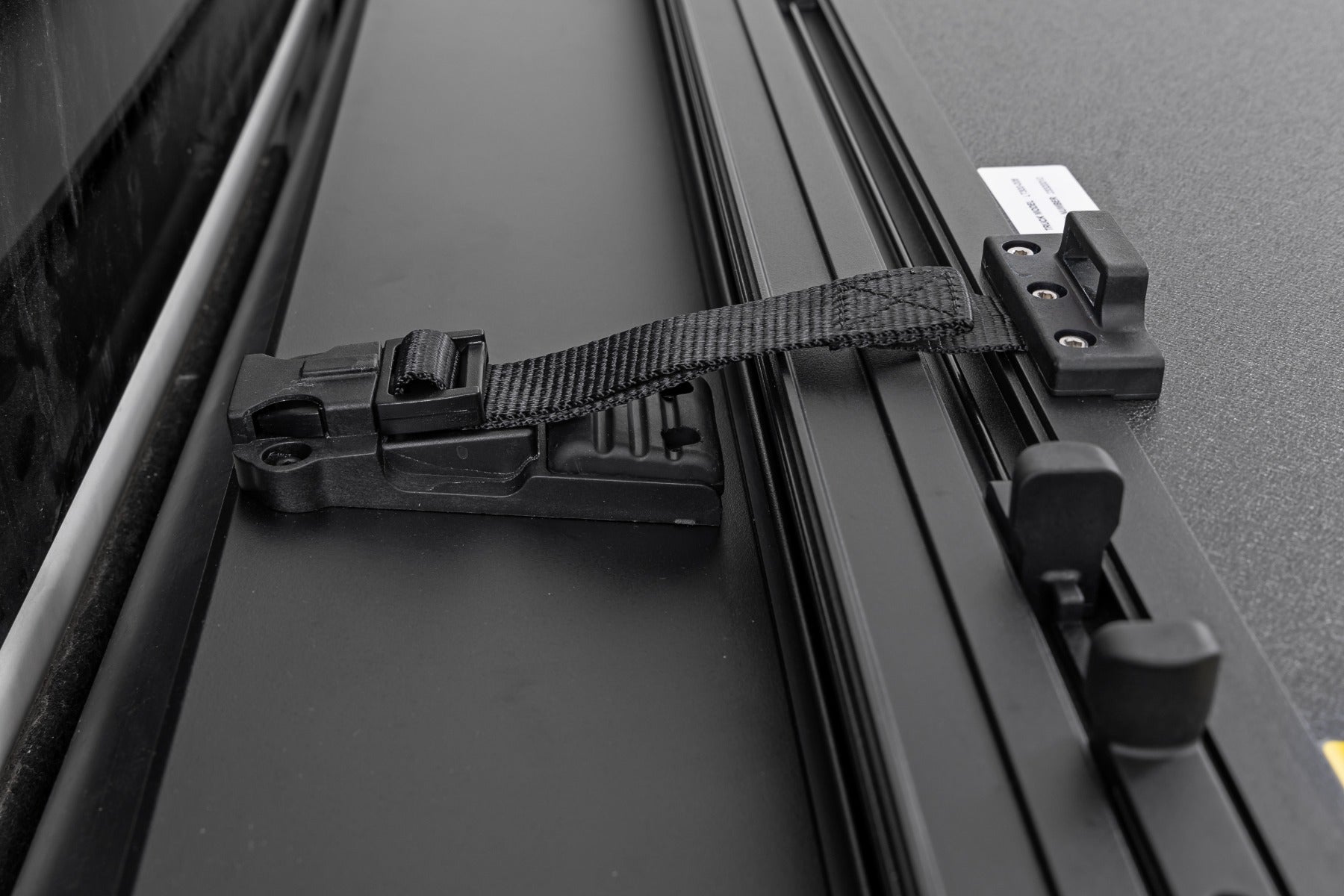 - Flush, low-profile design with stylish matte black finish frame and aluminum panels. Tri-Fold 3 panel design allows full bed access. Corrosion resistant black powder coated aluminum frame. Secure track and rail mounting system with drain tubes included. Quick-connect ball-in-socket prop rods secure the cover in the fully open position. Nylon straps secure the cover in the 2/3 open position. Drive with the cover in the fully open, 2/3 open or closed position. Auto latching design secures on closure. Convenient one hand operation squeeze latches release. No drill easy install and removal - all tools included. Nylon safety straps included. 5 Year Warranty.