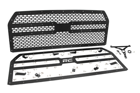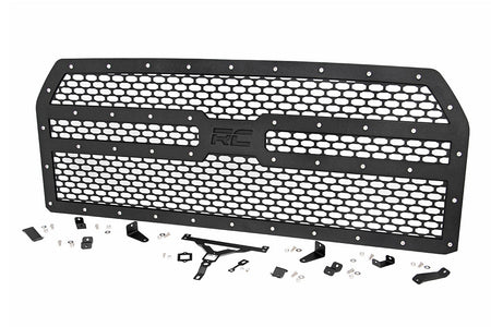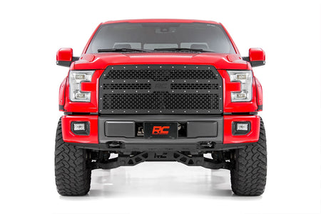 Give the front-end of your Ford F-150 a unique look with Rough Country?ÇÖs Mesh Grille kit! This easy to install grille replacement kit swaps out your stock grille with the eye-catching, head-turning good looks of this aftermarket upgrade. With a unique, laser-cut mesh pattern surrounded by stylish, stainless steel rivets, this grill gives your truck a more menacing look that?ÇÖs sure to draw attention. This easy-to-install grille requires no cutting or drilling and can be returned to stock at any time. Each kit is powdercoated black to resist corrosion and give a long lifespan of good looks. This kit also allows you to retain your active grille shutter system and front camera and features Rough Country?ÇÖs Lifetime Replacement Warranty!
