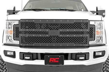 Give the front-end of your F-250 a unique look with Rough Country?ÇÖs Mesh Grille kit! This grille replacement kit swaps out your stock grille with the eye-catching, head-turning good looks of this aftermarket upgrade. This easy-to-install grille requires no cutting or drilling and can be returned to stock at any time. With a unique, laser-cut mesh pattern surrounded by stylish, stainless steel button head bolts, this grille gives your truck a more menacing look that?ÇÖs sure to draw attention. Each kit is powder-coated black to resist corrosion and give a long lifespan of good looks.