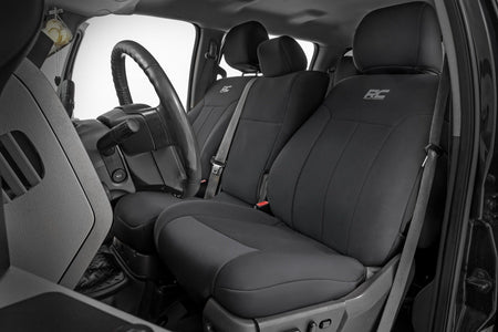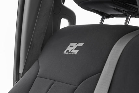 Want to protect your seats or are your seats showing signs of wear and tear from daily use? Say goodbye to unsightly stains and deterioration with Rough Country's Neoprene Seat Covers - the ultimate solution for preserving your vehicle's interior. Snug Fit for Optimal Protection: Our seat covers are tailored to fit your seats perfectly, providing a protective barrier against spills, scratches, and everyday wear and tear. Factory-Spec Construction: Engineered to meet factory specifications, our covers blend seamlessly with your vehicle's interior, giving it a fresh, new look without compromising on quality or style. Four-Layer Defense: With a four-layer construction featuring foam padding and a durable polyester shell, our seat covers offer unmatched protection and longevity, ensuring your seats stay looking new for years to come. Breathable and Water-Resistant: The neoprene layer not only provides breathability for added comfort but also boasts water-resistant properties, safeguarding your seats from spills and stains. Complete Coverage: Our covers come with full protection for your front seats, including headrest covers where applicable, as well as rear covers to shield your back seats from children and pet-related mishaps. Peace of Mind Warranty: Rest easy knowing your purchase is backed by our two-year warranty, giving you confidence in the durability and reliability of our product. Don't let worn-out seats diminish your driving experience. Upgrade to Neoprene Seat Covers today and enjoy a fresh, stylish interior that's protected against the rigors of daily life on the road.