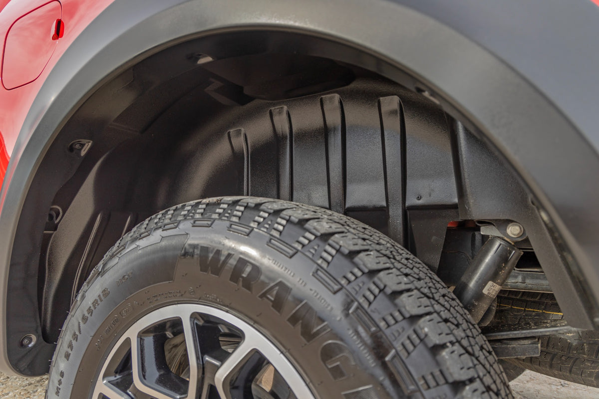 Give your rear wheel wells superior protection and a striking, new look with Rough Country's Rear Wheel Well Liners. Made of high-density Polyethylene plastic, these durable liners help conceal the unsightly gap between the body and frame which is more noticeable after lifting. The stylish, contoured design is perfectly tailored for a precise fit to your truck, while the all-black finish helps bring an aggressive look to the rear of your vehicle.Rough Country Rear Wheel Well Liners offer an extra barrier of protection to help shield your wheel wells from rocks, mud, salt, and harsh weather. With all the small, hard to clean areas covered, cleanup is fast and simple.Installation is easy too! Rough Country Rear Wheel Well Liners feature a bolt-on installation process that's easy enough to do with common tools in a home garage.