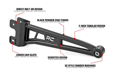 Elevate your fifth-generation Ford F-250/F-350 Super Duty with Rough Country's premium Tubular Radius Arms! Engineered to perfection, this upgrade kit is tailored for models with 3?ǥ or more of lift, ensuring a seamless fit and enhanced performance.Upgrade with Ease: Effortlessly install our Tubular Radius Arms on your Ford F-250/F-350 Super Duty with a 100% bolt-on design.Maximum Vibration Absorption and Longevity: Equipped with durable OE-Style Rubber Bushings, these tubular arms ensure maximum vibration absorption for a long lasting, smooth ride on any terrain.Precision Alignment: Maintain proper alignment without the need for additional drop brackets, enhancing handling and control without compromise.Stylish Design: With its sleek tubular-style design, our Radius Arm Kit adds a touch of aftermarket flair while boosting performance.Built to Last: Featuring a massive 2-inch outside diameter and gusseted design, these arms are built to withstand the toughest conditions, ensuring durability and reliability for years to come.Adjustable Alignment: Each Radius Arm includes lower cam slots to easily adjust caster for better handling on and off-road.Reform your fifth-generation Ford Super Duty today and conquer the road with confidence with our Tubular Radius Arm Kit!