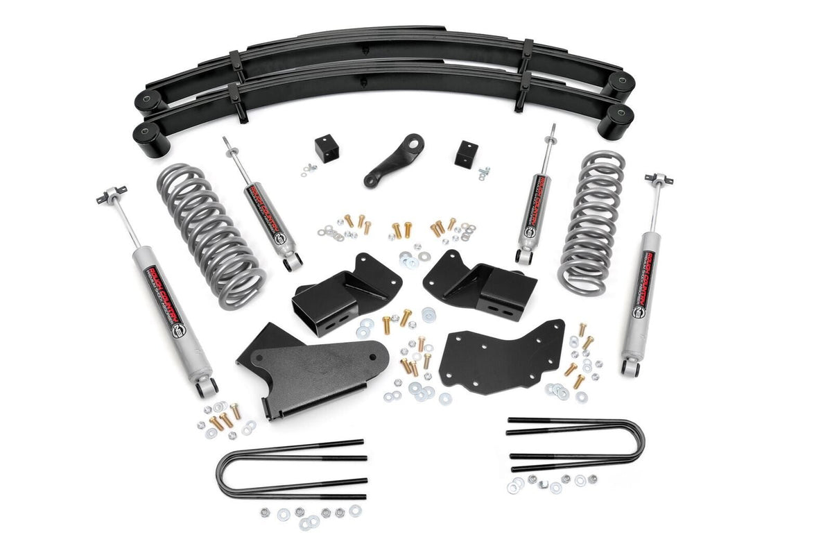 Give your 84-90 Ford Bronco II an aggressive look from front to rear with Rough Country?ÇÖs 4" Ford Suspension Lift Kit! This easy-to-install leveling kit raises the front of your vehicle to be equal height with the rear for a leveled, flush look that gives a better ride height and more aggressive appearance.\ This kit features a set of front, durable coil springs and rear leaf springs allowing you gain additional ride height without sacrificing ride quality or performance. A set of radius arm and I-Beam drop brackets are provided to keep everything at optimum angles for a factory-like ride, even after lifting. Our fabricated rear blocks offer considerably more strength than their cast iron counterparts.\ A set of Rough Country's premium N3 shocks are also included in this kit. These fine tuned 10-stage variable high-pressure Nitrogen charged shocks offer a fantastic blend of off-road action and smooth highway ride quality. With a durable 18mm spring-loaded piston rod and faster-cooling 54mm shock body.\ Get the wheels you want! Rough Country's 4" Ford Suspension Lift Kit comes with everything you need to fit up to a 31x10.5" tire with proper wheel backspacing.\ Best of all, Rough Country's 4" Ford Suspension Lift Kit is backed by our Lifetime Replacement Warranty.