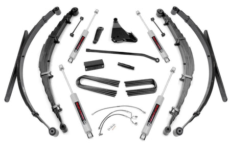 Give your 99-04 Ford Super Duty an impressive upgrade, front to back with Rough Country?ÇÖs 8" Ford Suspension System! This easy-to-install lift kit raises the front of your vehicle to be equal height with the rear for a leveled, better-than-stock look that gives an improved ride height and more aggressive appearance. This kit features a set of front and rearlifted leaf springs allowing you gain additional ride height without sacrificing ride quality or performance. A set of sway bar drop brackets and track bar are provided to keep everything at optimum angles for a factory-like ride, even after lifting. A set of Rough Country's premium N3 shocks are also included. These fine tuned 10-stage variable high-pressure Nitrogen charged shocks offer a fantastic blend of off-road action and smooth highway ride quality. With a durable 18mm spring-loaded piston rod and faster-cooling 54mm shock body. Get the wheels you want! Rough Country's 8" 99-04 Ford Suspension Lift System comes with everything you need to fit up to a 38" tire with proper wheel backspacing. Best of all, Rough Country's 8?ǥ Ford Suspension Lift System is backed by our Lifetime Replacement Warranty.