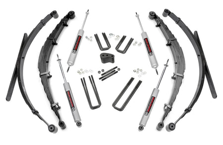 Give your 77-79?áFord Super Duty an impressive upgrade, front to back with Rough Country?ÇÖs 4" Ford Suspension Lift Kit! This easy-to-install lift kit raises increases your ground clearance to avoid any obstacles and provides a better-than-stock look that gives an improved ride height and more aggressive appearance.\ This kit features a set of front and rear, lifted leaf springs allowing you gain additional ride height without sacrificing ride quality or performance. A raised steering block and all necessary hardware is provided to keep everything at optimum angles for a factory-like ride, even after lifting.\ A set of Rough Country's premium N3 shocks are also included. These fine tuned 10-stage variable high-pressure Nitrogen charged shocks offer a fantastic blend of off-road action and smooth highway ride quality. With a durable 18mm spring-loaded piston rod and faster-cooling 54mm shock body.\ Rough Country's 4"?áFord Suspension Lift Kit comes with everything you need to fit up to a 35" tire with proper wheel backspacing.\ Best of all, Rough Country's 4?ǥ Ford Suspension Lift Kit is backed by our Lifetime Replacement Warranty.\ ?á