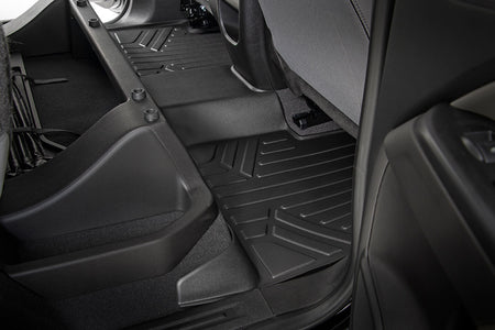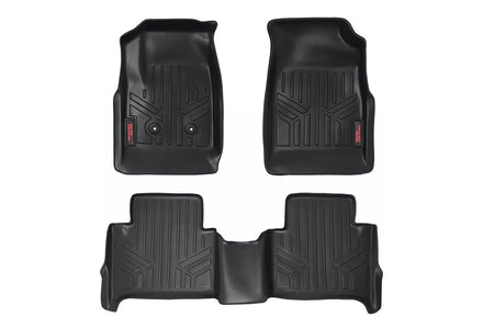 Keep your carpet in pristine condition with Rough Country's Floor Armor: Heavy Duty Floor Mats and Rear Cargo Liners. These eco-friendly, semi-flexible floor mats are made of an ultra-durable Polyethylene that offers a strong, rigid shape that's incredibly easy to clean. Where simple rubber floor mats fail, Rough Country's line of Floor Armor is guaranteed for life and will never crack, split, or break-down over time. The high-quality design extends the lifespan of your carpets and the raised-lip design ensures your interior will always be protected from mud, moisture, and more. These contoured floor mats are laser-measured for each make and model; designed to be a precise fit that grips the carpet and stays put. An aggressive looking textured surface gives your muddy shoes plenty of traction and looks great inside the vehicle. No matter what you track in, Rough Country Floor Armor is incredibly easy to clean. Just pop them out of the floorboards and rinse away the dirt! Includes Rough Country's Lifetime Replacement Warranty.