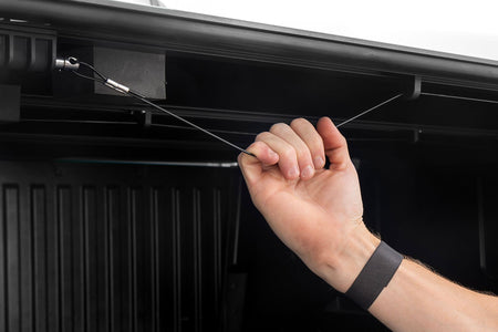 - Flush, low-profile design with stylish matte black finish frame and aluminum panels. Tri-Fold Design allows quick access to cargo. Corrosion resistant black powder coated aluminum frame. Secure track and rail mounting system with drain tubes included. Nylon straps secure the cover in the 2/3 open position. Drive with the cover in the 2/3 open or closed position. Auto latching design secures on closure. Single cable pull for easy latch release and access. No drill easy install and removal - all tools included. Nylon safety straps included. 5 Year Warranty.