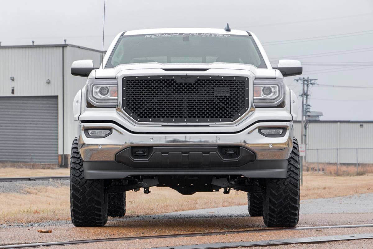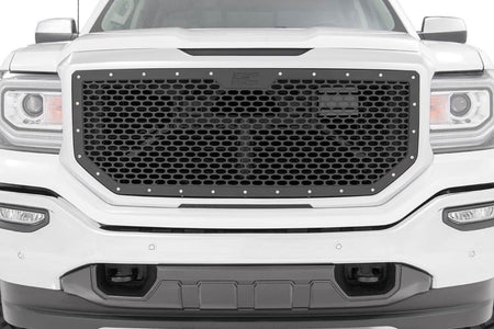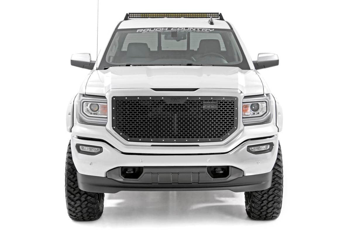 Give the front-end of your GMC 1500 a unique look with Rough Country?ÇÖs Mesh Grille kit. This grille replacement kit swaps out your stock grille with the eye-catching, head-turning good looks of this aftermarket upgrade. With a unique, laser-cut mesh pattern surrounded by stylish, stainless steel rivets, this grill gives your truck a more menacing look that?ÇÖs sure to draw attention. Each kit is powdercoated black to resist corrosion and give a long lifespan of good looks.
