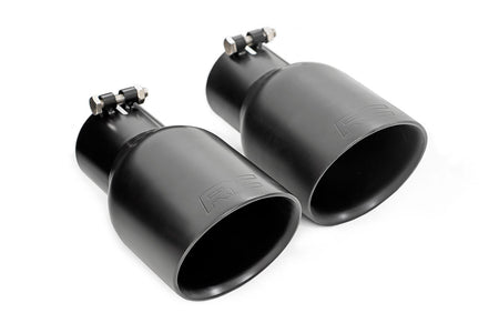 - 2.5-inch diameter high-flow design Matte Black Stainless Steel design features corrosion-resistant 409 stainless steel construction Chambered muffler offers throaty and aggressive sound 4-in 304 stainless dual wall exhaust tips Exhaust tips feature embossed "RC" logo Easy installation No cutting or drilling required