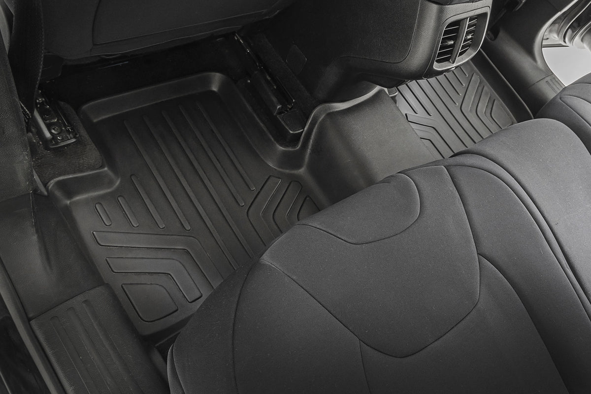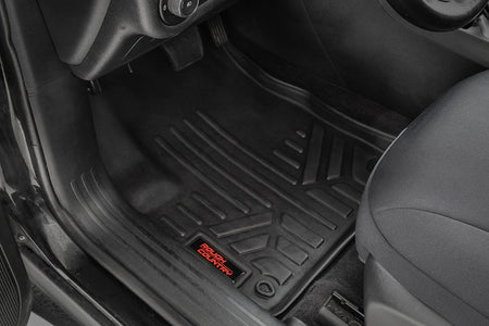 Keep your carpet in pristine condition with Rough Country's Floor Armor: Heavy Duty Floor Mats and Rear Cargo Liners. These eco-friendly, semi-flexible floor mats are made of an ultra-durable Polyethylene that offers a strong, rigid shape that's incredibly easy to clean.\ Where simple rubber floor mats fail, Rough Country's line of Floor Armor is guaranteed for life and will never crack, split, or break-down over time. The high-quality design extends the lifespan of your carpets and the raised-lip design ensures your interior will always be protected from mud, moisture, and more.\ These contoured floor mats are laser-measured for each make and model; designed to be a precise fit that grips the carpet and stays put. An aggressive looking textured surface gives your muddy shoes plenty of traction and looks great inside the vehicle.\ No matter what you track in, Rough Country Floor Armor is incredibly easy to clean. Just pop them out of the floorboards and rinse away the dirt! Includes Rough Country's Lifetime Replacement Warranty.