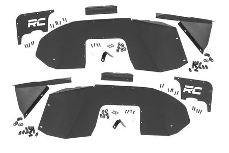 Superior Solution. Clean up the look of your inner fenders with Rough Country?ÇÖs JT Front Inner Fender Liners. This eye-catching inner fender upgrade helps protect your engine bay from dust, mud, and debris, and can be easily installed in no-time flat!\ Durable Upgrade. Aftermarket fenders are a huge improvement for most Jeeps wanting to get the best clearance and articulation possible, but when removing the stock fenders many people also remove the stock fender liners. Regain protection in this crucial area and protect your engine bay from the elements with Rough Country?ÇÖs innovative Front Inner Fender Liners. With a unique 3-piece construction, these liners cover more areas than other liners on the market, giving more protection to your engine bay and body panels. Each Rough Country liner features a corrosion-resistant powder coat for long-lasting durability. Additionally, these liners mount firmly to the body for quiet operation, free of rattling or vibration noise. The solid-steel, angular design with "RC?ǥ logo cutout gives an aggressive look to this now more visible area on your JT. An included, removable logo plate can be custom painted to any color you wish for a pop of extra color.\ Installation and Warranty. Rough Country Inner Fender Liners feature a bolt-on installation process with minor drilling for an easy upgrade you can do with common tools in a home garage. Rough Country's Inner Fender Liners come with our Limited Lifetime Warranty, so you can enjoy the peace of mind that comes with buying Rough Country products.