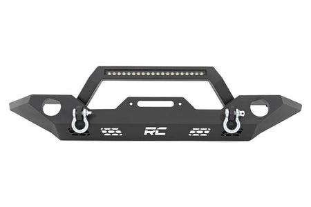 Transform the look and capabilities of your Jeep with Rough Country?ÇÖs Full Width LED Winch Bumper. This durable, steel bumper features aggressive good looks and packs plenty of features for traversing off-road obstacles. Rough Country?ÇÖs LED Winch Bumper features a full-width design that fits in nicely with the factory flare or aftermarket modifications. The tapered ends and high-clearance design offer plenty of clearance for optimum approach angles and articulation.This front bumper features a built-in Rough Country 20in Single-Row Black-Series LED Light Bar, providing 7,200 lumens and 100 watts of forward-facing illumination to help you easily see the trail ahead. This bumper is also designed to retain your factory fog lights, with two OE fog light ports that feature an ?ǣangry eyes?ǥ look. Each bumper also features multiple recovery options, such as a set of d-ring shackles and a winch mounting plate that can fit any standard-size winch.