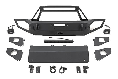 Transform the look and capabilities of your Jeep with Rough Country?ÇÖs Full Width Trail Bumper. This full-width version of our fan-favorite Stubby Trail Bumper includes a few extra features you?ÇÖre sure to enjoy!\ Rough Country?ÇÖs Jeep LED Trail Bumper has been engineered with a full-width design that fits in nicely with the factory flare or aftermarket modifications. With Jeep adding turn signals to the factory flares on JL and JT models, a full-width bumper can help lend an aggressive off-road look to your Jeep even when retaining the factory flare.\ Each kit includes a modular integrated fog light mount that allows you to run the included Rough Country 2-inch flush-mount led cubes. This front bumper also features a built-in Rough Country 20in Single-Row Black-Series LED Light Bar, providing 7,200 lumens and 100 watts of forward-facing illumination to help you easily see the trail ahead.\ Rough Country?ÇÖs Full-Width Trail Bumper also features a set of D-ring shackles for a convenient recovery point, as well as a winch plate allowing you to install any standard-sized winch. A protective skid plate ensures unbeatable protection in off-road environments. If you?ÇÖre looking for one of the best Jeep bumpers available, look no further!