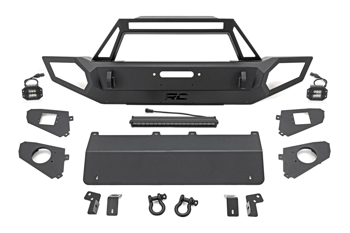 - Full-width design with a laser cut "RC" logo. Bumper is coated in a durable satin black powder coat finish. Includes modular fog light mounts. Includes mounting plates to retain factory fog lights. Winch plate is integrated into the bumper. Includes D-ring set - 4.75 ton capacity. Includes (2) 2-inch Black-Series Flush Mount LED Cubes - 2880 Lumens | 36 watts Includes 20-inch Single-Row Black-Series LED Light Bar - 7200 Lumens | 90 watts LED Cubes are IP67 Waterproof rated.