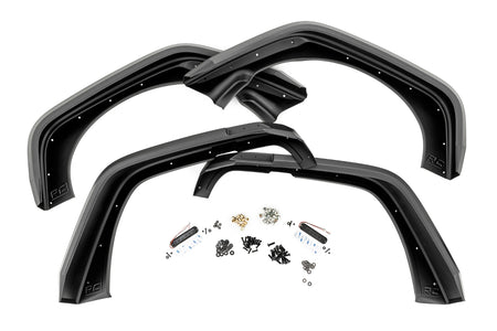 Innovative Design and Added Protection. Increase your Wrangler's tire clearance and protective features while adding impressive good looks with Rough Country's High Clearance Flat Fender Flares. These aggressively good-looking flares transform your JK's exterior boasting 9-inches of front tire coverage and 4.5-inches of rear tire coverage these uniquely designed flares are sure to protect your Jeep's body from mud or road debris kicked up by the tires.\ Lightweight and Durable. Designed to handle on or off-road terrain Rough Country's fender flares are constructed of a flexible UV Stable Black TPO plastic. This material is lightweight and can endure the elements. The UV treatment process eliminates chalking and helps prevent sun fading. Each flare set features two led front marker lights, each marker features 6 bright LEDs that are sure to keep you visible at night!\ Installation.?áRequiring minor drilling and wiring to install, installation couldn't be easier. With an estimated timeframe of 2-3 hours this full kit can be installed at home using standard tools and can be completed efficiently and quickly!\ Limited Lifetime Replacement Warranty. Rough Country's High Clearance Flat Fender Flares are backed with a limited lifetime replacement warranty towards manufacturer defects. As such, the product is protected from structural and workmanship damage after the date of purchase. With our industry-leading warranty give yourself peace of mind when using Rough Country products!