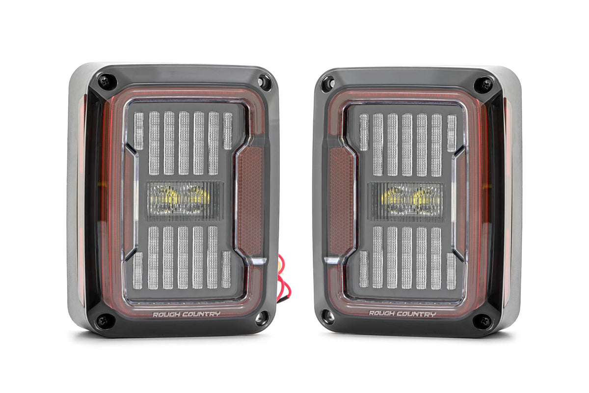 Stylish Appearance. Improve the function and looks of your Jeep Wrangler JK with Rough Country's LED Tail Lights. These easy-to-install headlights offer incredible illumination while transforming the look of your rear-end.Innovative Design. Rough Country's LED Tail Lights are DOT/SAE certified to be street legal and feature a durable IP67 waterproof housing for a long lifespan of illumination.?á Featuring a durable black housing and unique smoked lense this must-have upgrade will set you apart from the pack. This high-quality upgrade features a "C" shaped running light design and ultra-bright LEDs to ensure that you will be noticed on or off-road. Rough Country's LED Tail Lights are equipped with a heat-resistant lens that is sure to prevent any discoloration. Offering a built-in anti-flicker load resistor this simple plug and play design is ready to go as soon as it arrives!\ Installation. Each tail light kit features a 100% bolt-on installation process and includes a handy adapter for an easy plug-and-play setup. With an estimated timeframe of 1-2 hours this full kit can be installed at home using standard tools and can be completed efficiently and quickly!\ 3-Year Replacement Warranty. Rough Country's LED Tail Lights are backed with a three-year replacement warranty towards manufacturer defects. As such, the product is protected from structural and workmanship damage after the date of purchase. With our industry-leading warranty give yourself peace of mind when using Rough Country's Suspension products!?á