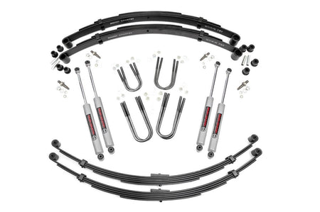 Give your Jeep an aggressive look from front to rear with Rough Country?ÇÖs 3" Jeep Suspension Lift System! This easy-to-install leveling kit raises the front of your vehicle to be equal height with the rear for a leveled, flush look that gives a better ride height and more aggressive appearance.\ This kit features a set of front and rear, durable leaf springs springs allowing you gain additional ride height without sacrificing ride quality or performance.\ A set of Rough Country's premium N3 shocks are also included in this kit. These fine tuned 10-stage variable high-pressure Nitrogen charged shocks offer a fantastic blend of off-road action and smooth highway ride quality. With a durable 18mm spring-loaded piston rod and faster-cooling 54mm shock body.\ Get the wheels you want! Rough Country's 3" Jeep Suspension Lift System comes with everything you need to fit up to a 32" tire with proper wheel backspacing.\ Best of all, Rough Country's 3" Jeep Suspension Lift System is backed by our Lifetime Replacement Warranty.