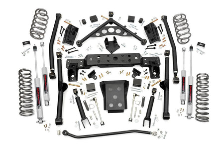 The long awaited WJ 4-inch Longarm Kit is a comprehensive package including everything needed for a great suspension lift while maintaining the vehicle's crucial center of gravity. Upgrade your WJ and gain aggressive looks, extreme flex, and enough ride height to run up to 31-inch tires. The kit includes adjustable high-clearance X-Flex upper and lower control arms with durable rubber bushings, featuringX-Flex joints. The kit also includes front and rear coil springs, a front adjustable track bar with drop bracket, 1/4-inch thick steel crossmember, skid plate and sway bar disconnects. Outfitted with Rough Country's N3 shocks, this Longarm Lift Kit is a total solution comprised of top-notch components designed for the avid off-roader who wants the most out of their WJ.\ \ This top of the line kit focuses on improving off-road handling and articulation while preventing binding and rear steer. This lift kit features high-clearance components with a front 4-link and rear y-link control arm design. This promotes extreme flex while keeping pinion angles optimized. Utilizing adjustable components, this kit can also accommodate future modifications.
