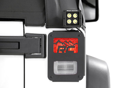 Protect your tail lights while enhancing the look of your Jeep with Rough Country?ÇÖs JK Tail Light Covers. These sleek and stylish covers offer superior protection for your tail lights while allowing ample light to pass through when braking or reversing. The three-dimensional ?ǣshroud?ǥ design totally envelops your tail light on all 4 sides, offering considerably more protection than simple add-on bezels found on the market. For even more functionality, Rough Country JK Tail Light Covers feature a standard-sized mounting point on the top of each cover allowing you to mount a small LED Light - like our 2-inch LED cubes - for easy and convenient rear lighting. Hook up to a trailer with ease, or reverse more confidently in off-road scenarios with this handy LED mounting position. Each solid-steel tail light cover is powdercoated black to provide aggressive good looks while withstanding the elements. Best of all, Rough Country?ÇÖs JK Tail Light Covers feature a Lifetime Replacement Warranty!