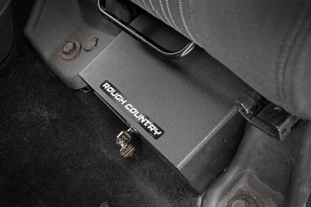 Clean up the contents of your cab with Rough Country?ÇÖs Custom-Fit Jeep Under Seat Storage Lock Box. This handy under seat storage box provides a hidden lockable storage space to secure your gear all while being tucked out of sight. Keep your tools, gear, and other odds and ends organized and stowed away under the front drivers seat. Each under seat storage box is constructed from a durable, heavy duty 16 gauge steel construction that?ÇÖs built to withstand kicks, nicks, and corrosion. A convenient textured surface helps prevent your under seat cargo box from sliding around while driving. Best of all, Rough Country?ÇÖs Custom-Fit Under Seat Storage box is easy to install, so you can upgrade your cargo management quickly and easily!