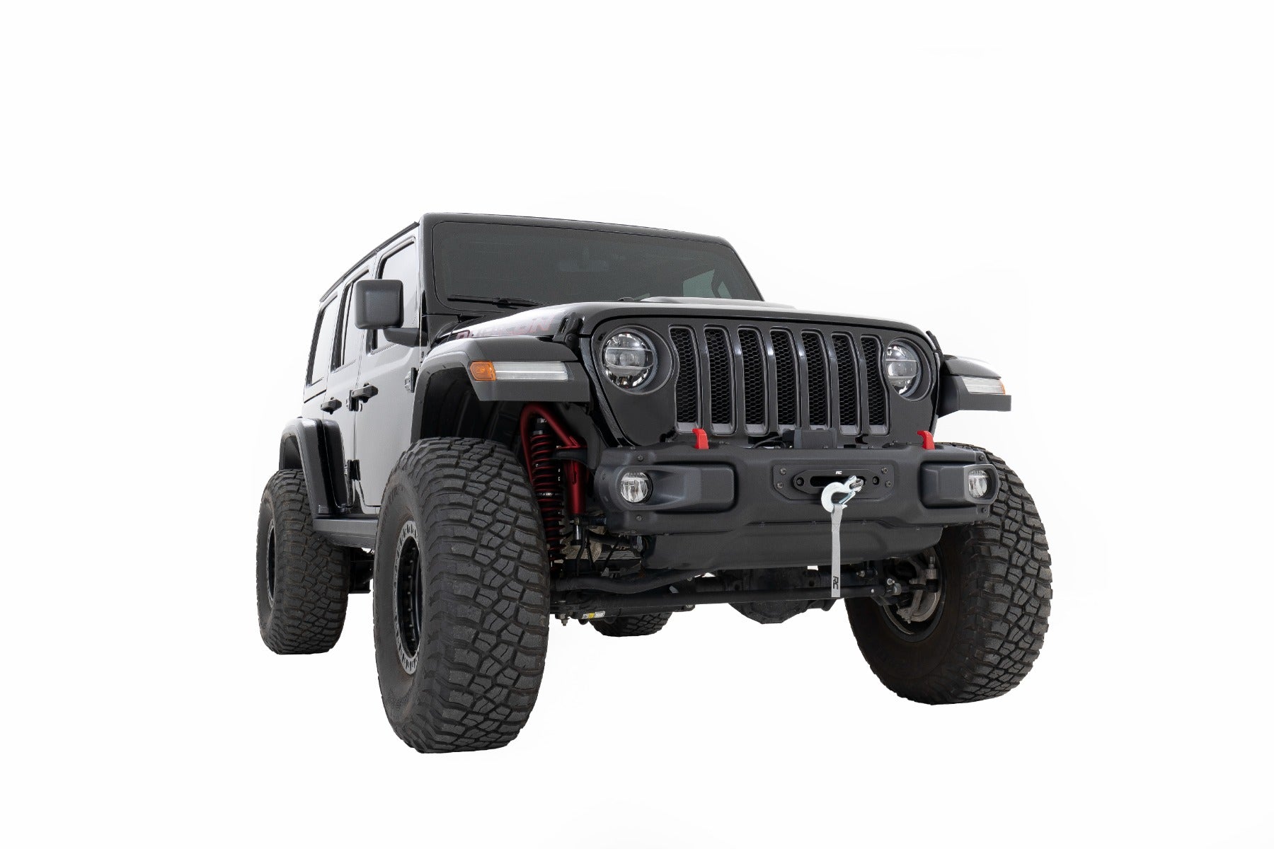 Superior Style. Get ready for off-road adventures with Rough Country's Winch Mounting Plate for the Jeep Wrangler JL 4WD. This stylish recovery solution is hidden behind the OEM modular steel bumper for a sleek look while still providing the functionality you need. The standard 4.5in x 10in 4 bolt mount will accommodate most winches on the market, giving you the versatility to choose the right winch for your needs.\ Heavy-Duty Steel Construction. Rough Country's Winch Mounting Plate is the perfect addition to your JL. With its durable black carbon powder coating and heavy-duty 7GA steel construction, this mounting plate can handle anything the off-road throws at it. It has been engineered NOT to impede airflow to the radiator, so you can tackle any obstacle without worrying about your engine overheating. The flush design leaves only the hawse fairlead and tow hook exposed, giving your Jeep a clean, polished look while ensuring maximum functionality.\ Installation and Warranty. Since the front bumper stays in its stock location, installing our Winch Plate is a breeze and can be completed by just one person. And with Rough Country's commitment to quality, you can have peace of mind with the included Limited Lifetime Warranty.