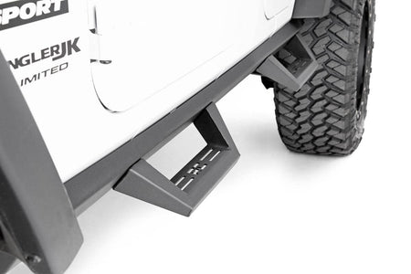 Get a one-of-a-kind, unique look for your Jeep JK with Rough Country?ÇÖs Contoured Drop Steps. These stylish wheel-to-wheel steps offer a unique look for your vehicle, with two integrated drop steps to help you easily climb into your cab. This step was engineered with a discrete, contoured design to perfectly complement the body lines of your Jeep JK, offering a tight, flush fit that looks good enough to be a factory option! Each integrated step is fabricated for strength and durability, and features a laser cut, accented ?ǣRC?ǥ logo for a one-of-a-kind look and feel. These durable steel steps offer unrelenting reliability, and are powdercoated black to resist corrosion for a long life of great looks. Rough Country Steps include a Lifetime Replacement Warranty!
