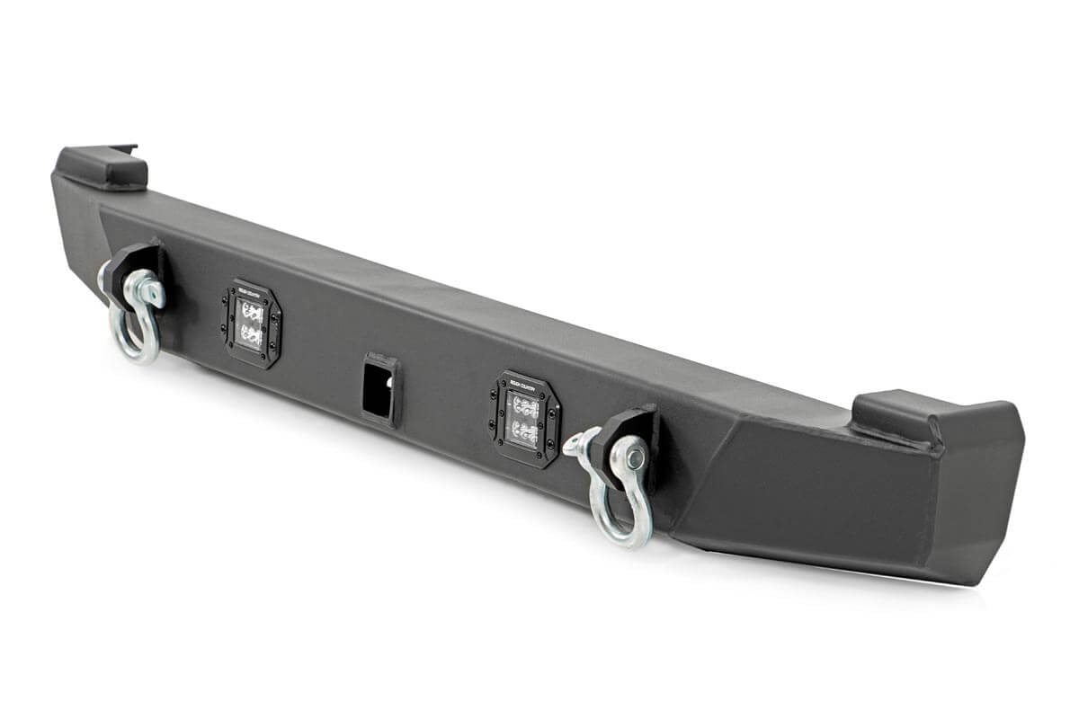 Give your Jeep a rugged, aggressive look with Rough Country?ÇÖs Jeep XJ Rear LED Bumper. This durable rear bumper offers a drastic improvement over the flimsy, factory bumper. With a solid-steel, 3/16?ǥ construction and eye-catching good looks.Rough Country?ÇÖs Rear LED Bumper features a set of flush mount 2in LED cubes in the perfect position for rear-facing illumination. Each bumper also includes a set of heavy-duty d-rings with welded mounts and a recessed 2in receiver, giving you plenty of tools to navigate any trail.This low-profile bumper compliments the XJ body much better than the molded-plastic stock equipment, with a wrap around design that replaces the bulky end caps for a more aggressive, off-road look. Add our optional Lower Quarter Armor Plate to complete the look! Best of all, this bumper features an easy, bolt-on installation process!