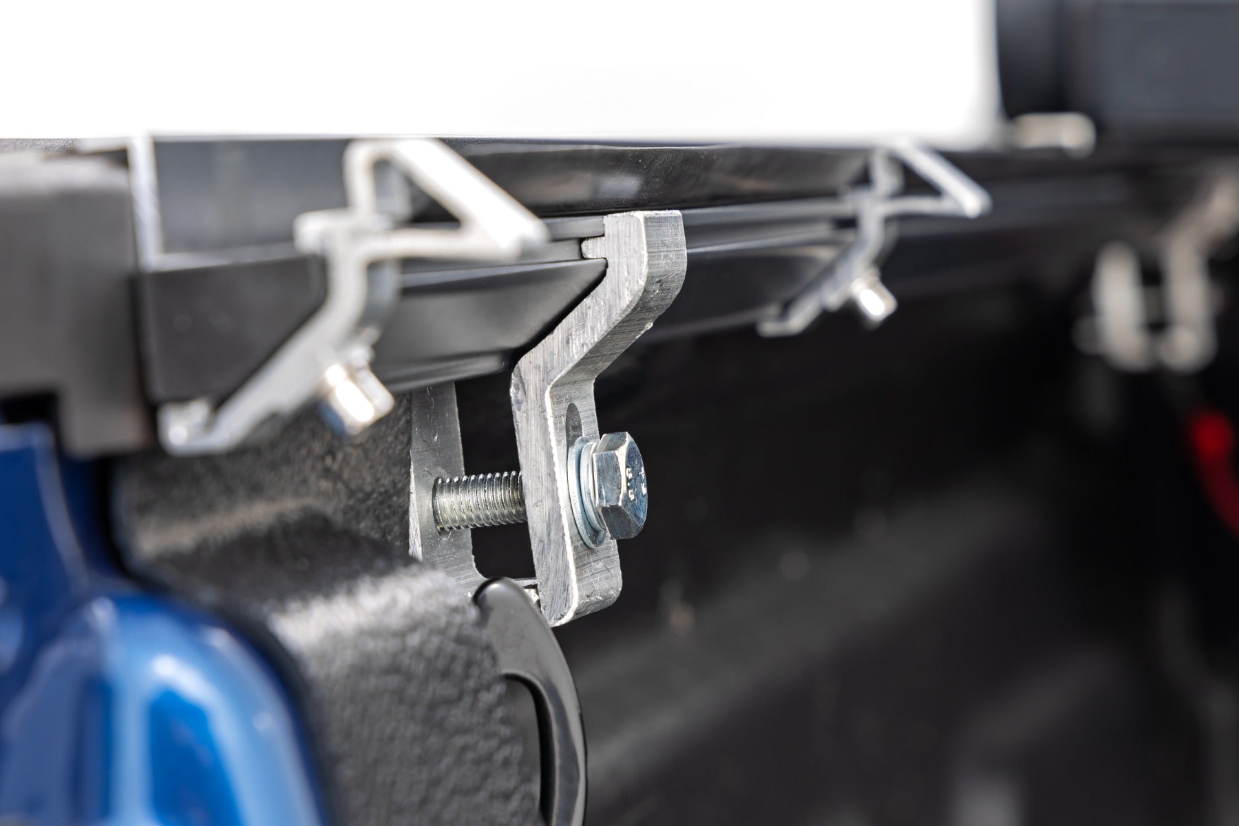 - Flush, low-profile design with stylish matte black finish frame and aluminum panels. Tri-Fold Design allows quick access to cargo. Corrosion resistant black powder coated aluminum frame. Secure track and rail mounting system with drain tubes included. Nylon straps secure the cover in the 2/3 open position. Drive with the cover in the 2/3 open or closed position. Auto latching design secures on closure. Single cable pull for easy latch release and access. No drill easy install and removal - all tools included. Nylon safety straps included. 5 Year Warranty.