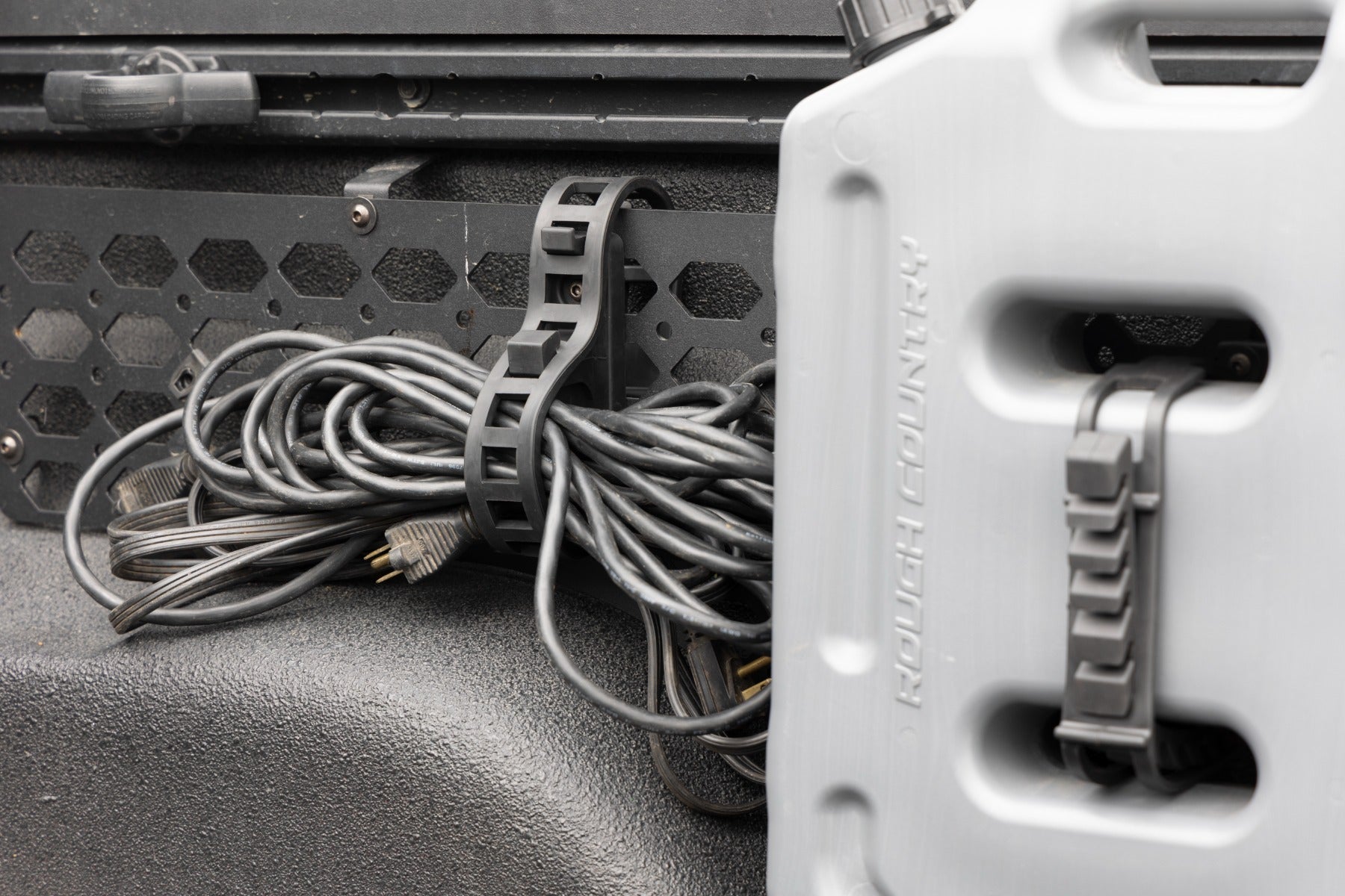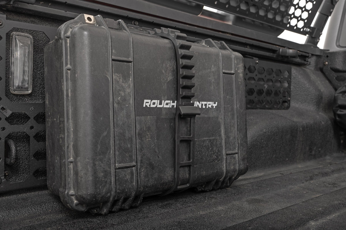- Two Clamps per package = 4 pieces Two 14" separate straps that can hold round objects up to 15" in diameter. Each clamp set supports a safe working load of 150lbs. Each half of clamp mounts with 4 6mm bolts. Mounting area 2" x 2" Mount fuel / liquid containers with easy access on and off. Includes mounting hardware compatible with Rough Country Molle panel pattern and other Military panel patterns.