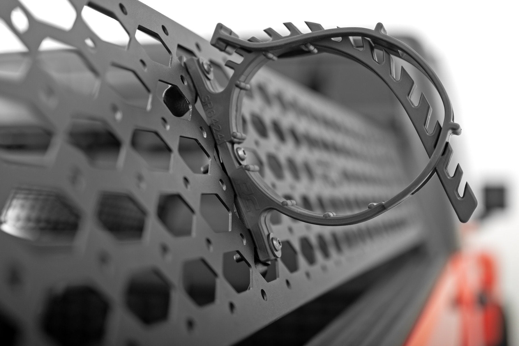 - Two Clamps per Package. Holds objects from 2 1/2" to 9 1/2" diameter. With wide diameter range can accommodate odd shape objects i.e. square , rectangular. Each clamp supports a safe working load of 50lbs. Mounts with three 6mm bolts. Mounting area 6" x 7/8" Includes mounting hardware compatible with Rough Country Molle panel pattern and other Military panel patterns.
